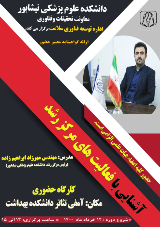 به اطلاع کلیه اعضای هیات علمی دانشکده علوم پزشکی نیشابور میرساند کارگاه "آشنایی با فعالیت های مرکز رشد" در روز چهارشنبه مورخ 1400/03/12 ساعت 15-13 در محل سالن آمفی تئاتر (واقع در دانشکده بهداشت) توسط استاد ارجمند جناب آقای مهرزاد ابراهیم زاده برگزار میگردد.