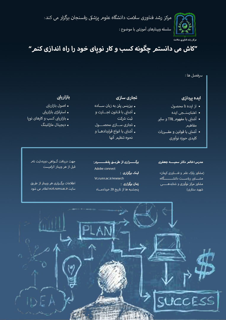 مرکز رشد فناوری سلامت دانشگاه علوم پزشکی رفسنجان بنا دارد سلسه وبینارهای آموزشی هفتگی تحت عنوان «کاش میدانستم چگونه کسب و کار نوپای خود را راهاندازی کنم» برگزار نماید.